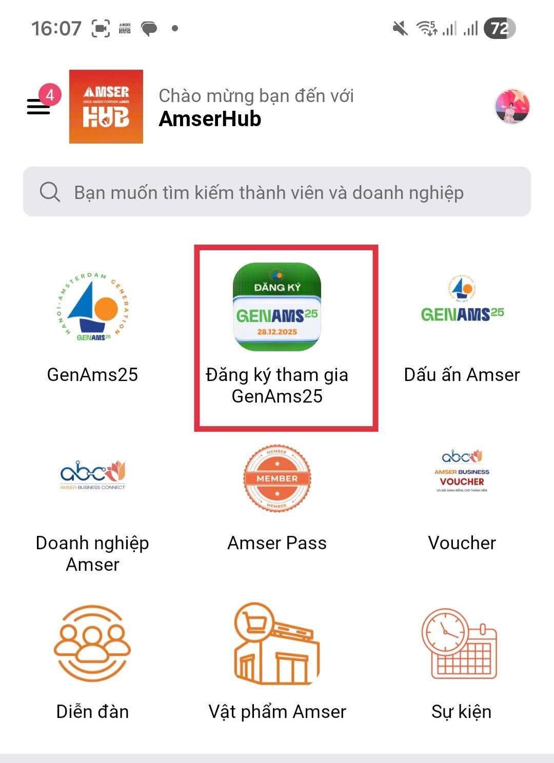 - Bước 1: Mở Mobile App Amser Hub https://share.abphotos.link/BybMro hoặc truy cập vào website: https://amserhub.hn-ams.org/danh-muc/genams25