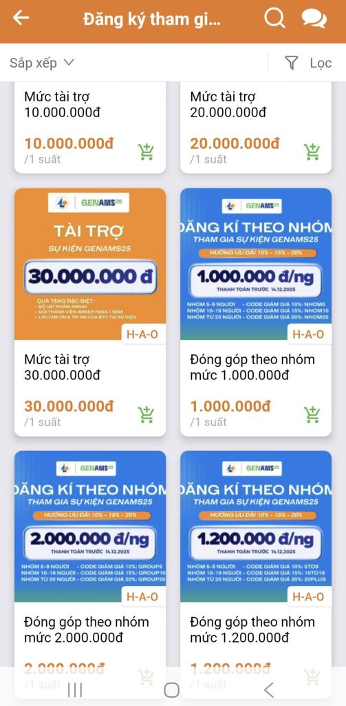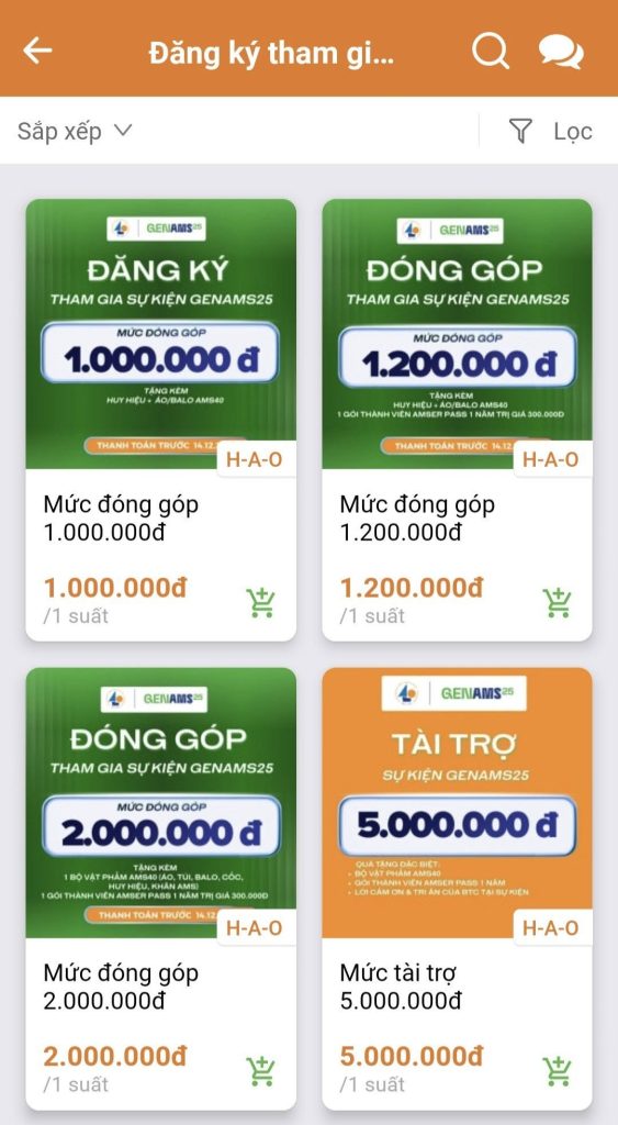 - Bước 3: Lựa chọn mức đóng góp hoặc tài trợ phù hợp (đóng góp cá nhân mức 1 triệu – 1,2 triệu – 2 triệu, đăng kí theo nhóm từ 5 người trở lên để nhận ưu đãi đến 20% hoặc tham gia các gói tài trợ cá nhân/tập thể/khoá/hội nhóm/clb (ảnh 2 &3)